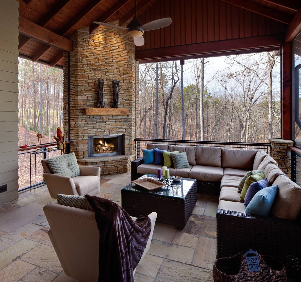 Угловой камин в дизайне застекленной террасы