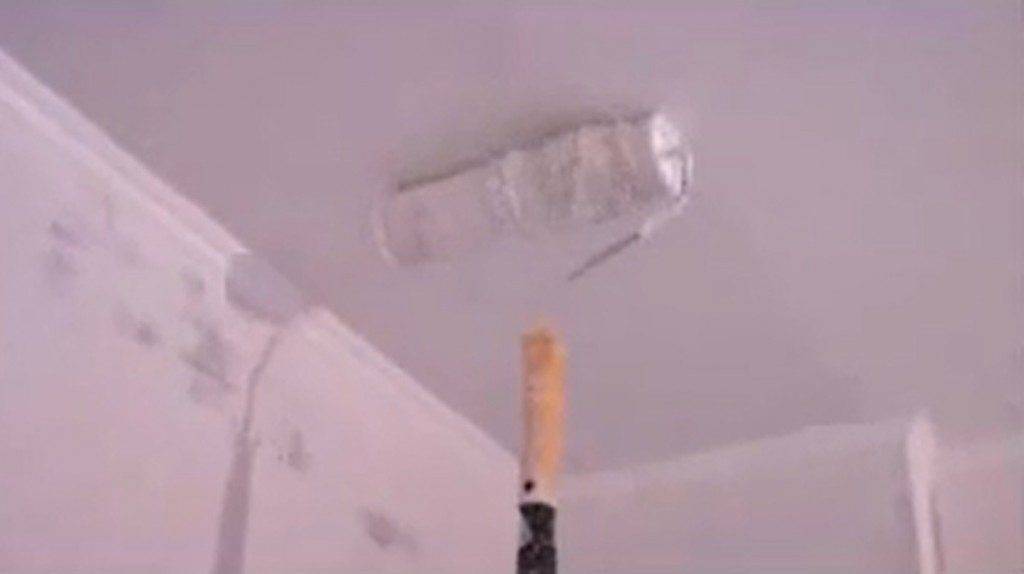 Смывают покрашенный водоэмульсионкой потолок дважды обильно смачивая горячей водой. Вода должна быть почти кипяток — около 70°C. Намочив часть потолка подождите 10 минут, потом еще раз смочите тот же участок горячей водой. Минут через пять можно снимать краску шпателем.