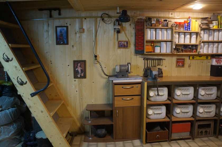 Пол в гараже сделан из тротуарной плитки, под колесами уложены плиты натурального гранита