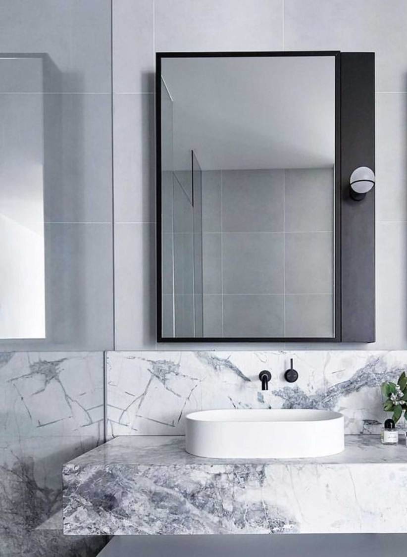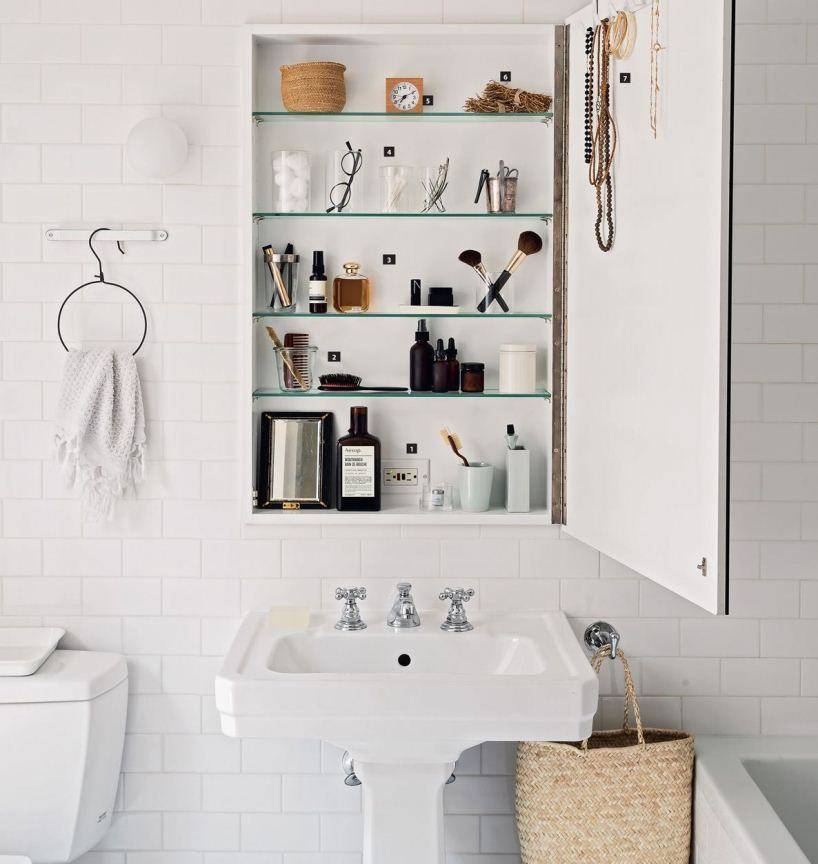 Вместо зеркала используйте зеркальный шкаф, в котором удобно хранить крема, щетки, пасты и средства для умывания.