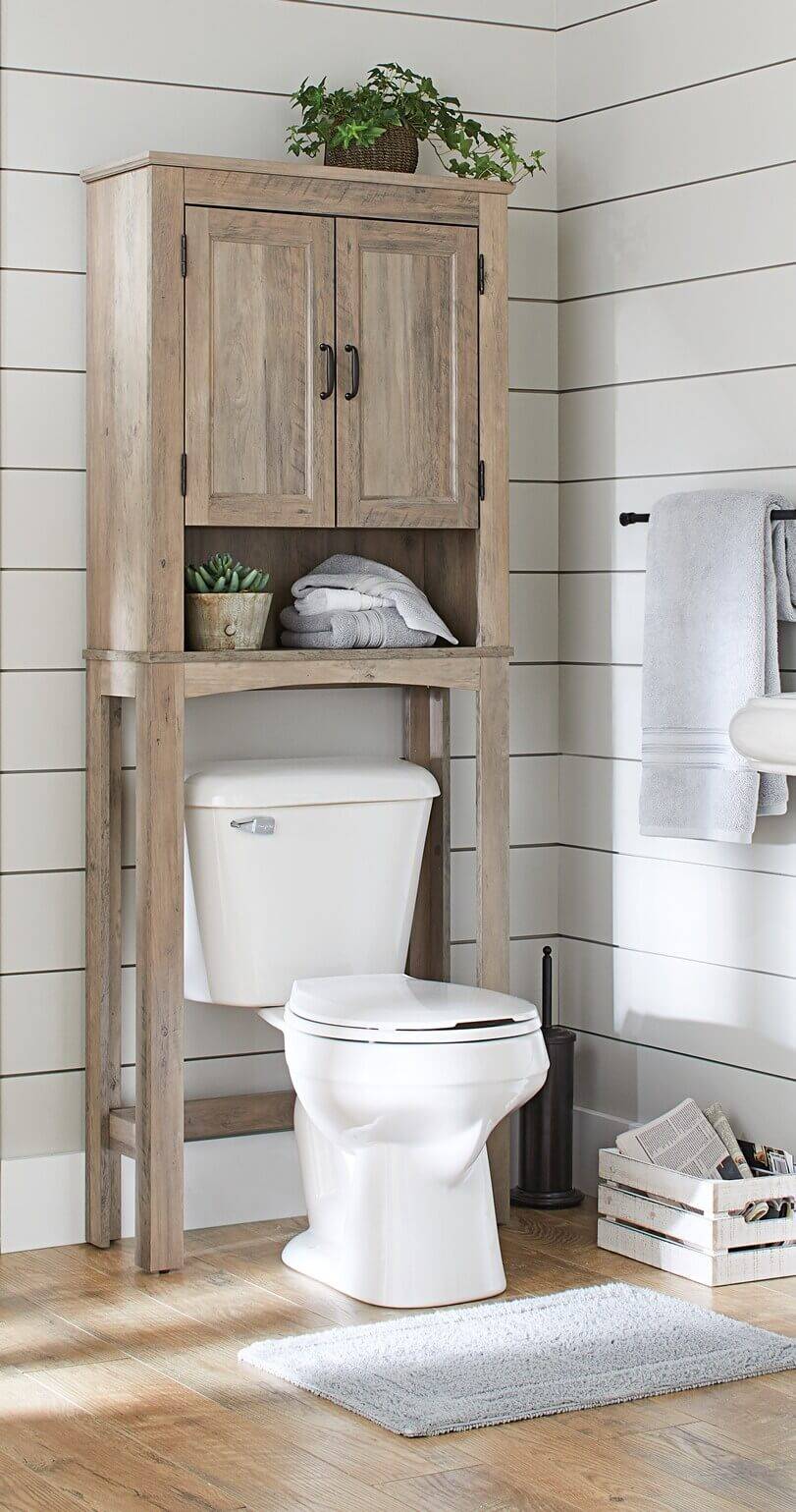Неглубокие полки или шкафы разместите над унитазом, и вы получите дополнительное место для хранения запасов туалетной бумаги, освежителей воздуха, моющих средств и других предметов.