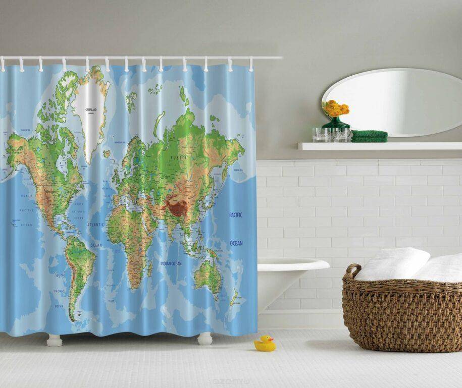 Также зачастую для ванной комнаты требуются шторки для душа – они нужны, чтобы вода не проливалась на пол за края душевой кабины или ванны: оформление подобных шторок может быть любым, от однотонных вариантов до репродукций картин и фотографий.