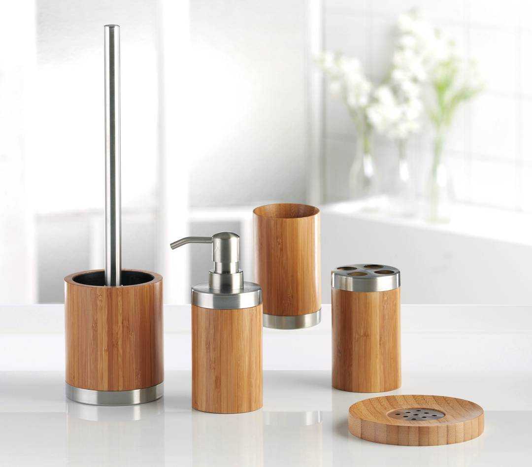 Красивый и благородный материал. Коллекции аксессуаров из него станут украшением ванной в стиле лофт, этника или минимализм. Особенно популярны изделия из бамбука, облагающие высокой прочностью, влагостойкостью и малым весом.