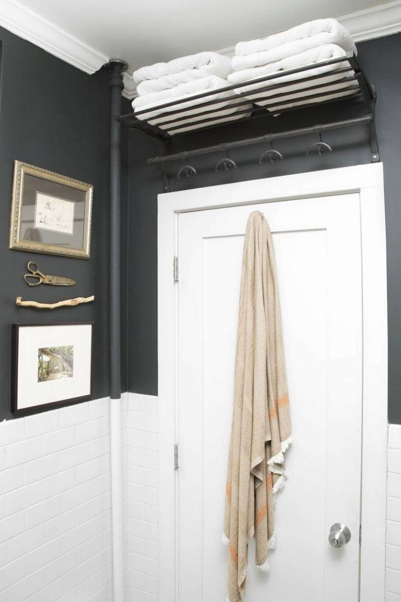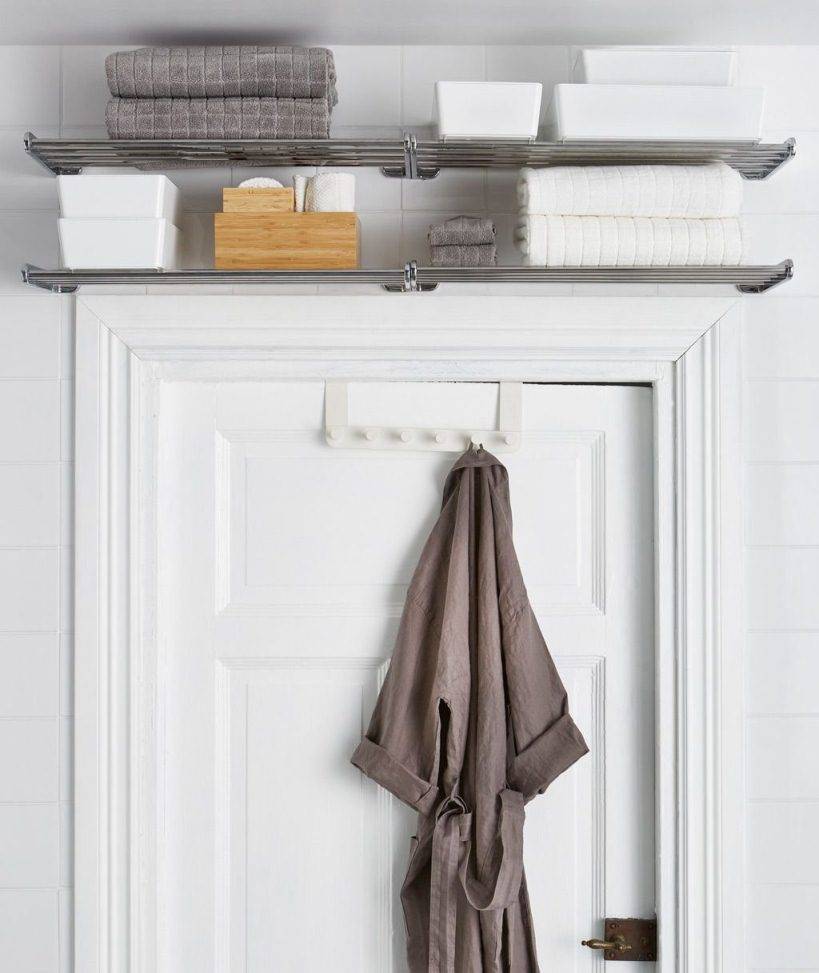 Самая маленькая полка над входной дверью сделает небольшой санузел вместительнее.