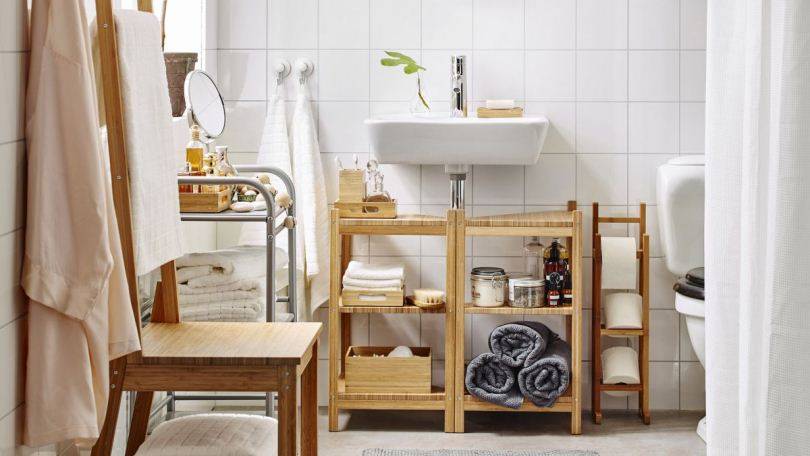 Не оставляйте пустовать место под раковиной. Разместите там небольшой шкафчик или полку.