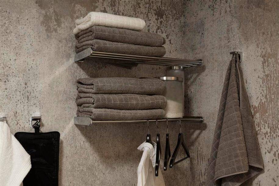 Полотенец должно быть много. Ведь только одному члену семьи требуется целых четыре: для тела, для головы, для ног и для лица. Для хранения можно использовать сушилку, полочки или крючки.