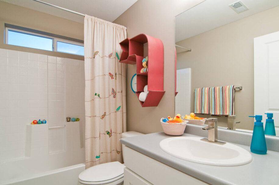 Различные детские аксессуары также характерны для ванной комнаты в большой семье. Это могут быть удобные градусники для воды на присосках, всевозможные резиновые игрушки для ванной, функциональные небольшие ванночки для малышей, комплекты для выдувания мыльных пузырей или заводные игрушки.