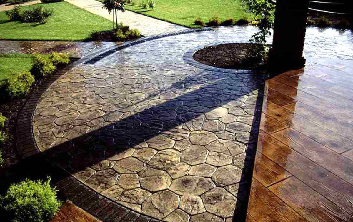 Декоративное оформление пешеходной зоны делают из классического бетона. Технология называется печатной из-за рельефной поверхности, которую формируют с помощью штампованных заготовок. Таким образом получается рисунок с имитацией брусчатки, кирпича, каменной кладки или дощатого настила. Реже наносят рисунок идентичный тканям, шкурам, следам животных, листьев. Оттиск выбирается индивидуально.