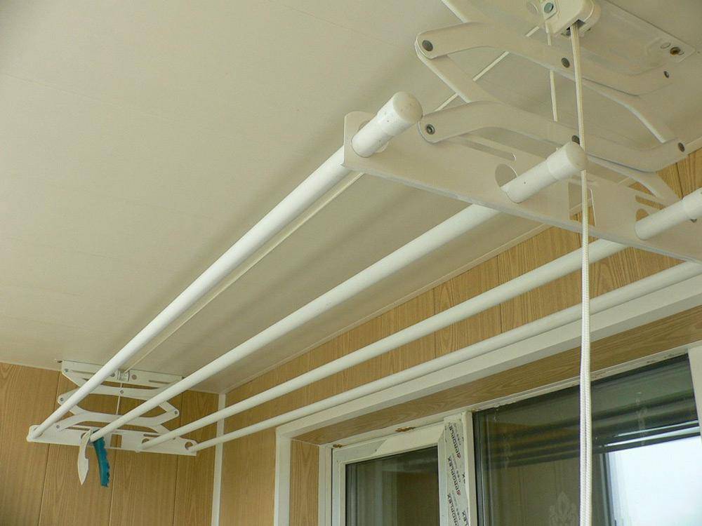 Большинство владельцев городских квартир выбирают подвесной вариант сушилок, закрепленных на потолке, имеющих высокую вместимость и не загромождающих балкон. Жестко закрепленную на потолке конструкцию относят к самым надежным устройствам. Две металлические рамки-держатели, оборудованные несколькими зафиксированными трубками, крепят на потолке. Если сушильную систему прочно закрепить, она выдержит до 50 кг мокрых вещей при отсутствии ограничений на длину, но развешивать вещи придется, пользуясь табуретом.