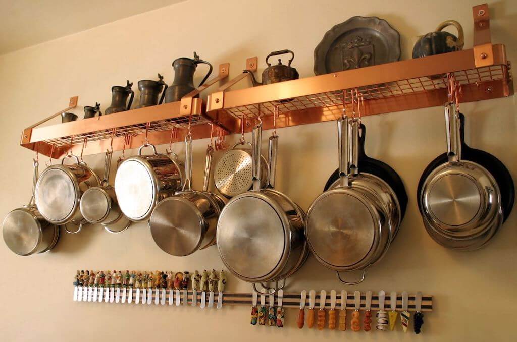 Для хранения кастрюль на кухне, а также сковородок можно установить многоярусные конструкции. Хорошо, если на них будут крючки, чтобы вешать сковородки и ковшики. Такие конструкции также подойдут для хранения тарелок и кружек.