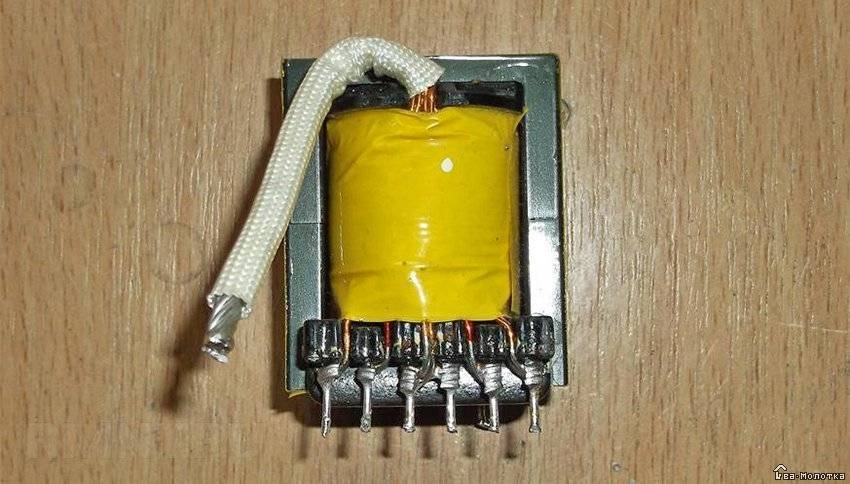 Первичная обмотка покрывается двумя слоями лавсановой изоленты, затем наматывается высоковольтная вторичная обмотка и ещё один слой изоляции. Важный момент — мотать «вторичку» нужно в обратном направлении, иначе трансформатор работать не будет. В завершение к одному из отводов нужно припаять в разрыв полупроводниковый термопредохранитель, ток и температура срабатывания которого определяются параметрами провода вторичной обмотки (корпус предохранителя нужно плотно примотать к трансформатору). Сверху трансформатор обматывается двумя слоями виниловой изоляции без клейкой основы, конец закрепляется стяжкой или цианакрилатным клеем.