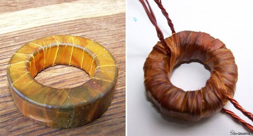 Перед намоткой кольцо сердечника нужно подготовить — снять надфилем острые кромки и плотно обмотать изолятором — стеклотканью, пропитанной эпоксидным клеем. Далее следует намотка первичной обмотки из толстого медного провода расчётного сечения. После набора нужного количества витков их необходимо равномерно распределить по поверхности кольца с равным интервалом. Выводы обмотки соединяются согласно схеме и изолируются термоусадкой.