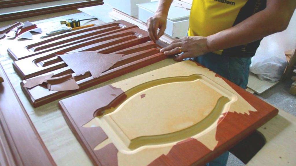 Если возникли повреждения (дыры, трещины, следы от огня), нужно полностью обновить покрытие. С детали снимают ручки, петли и другую фурнитуру, очищают и просушивают, после чего наклеивают пленку. Нужный цвет и фактуру помогут подобрать в мебельной фирме или специализированном магазине, главное – показать образец.