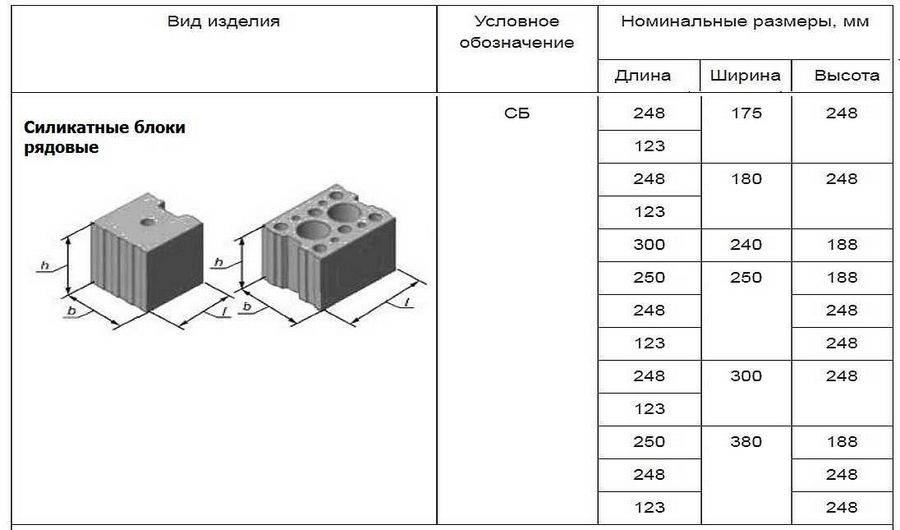 - Силикатный блок (в маркировке СБ) и силикатный блок укрупненный (обозначается СБУ). Изделие, имеющее ширину тычка больше 130 мм. Размеры силикатных блоков приведены в таблицах. Их применяют для возведения перегородок, отделочных блоков не бывает. Их торцовые части (тычки) могут иметь сформированные пазогребневые края. Это позволяет повысить теплоизоляционные характеристики кладки, так как исключается прямой промерзающий шов.