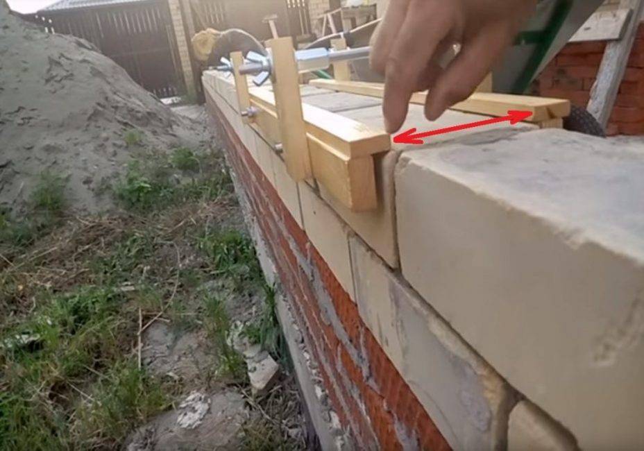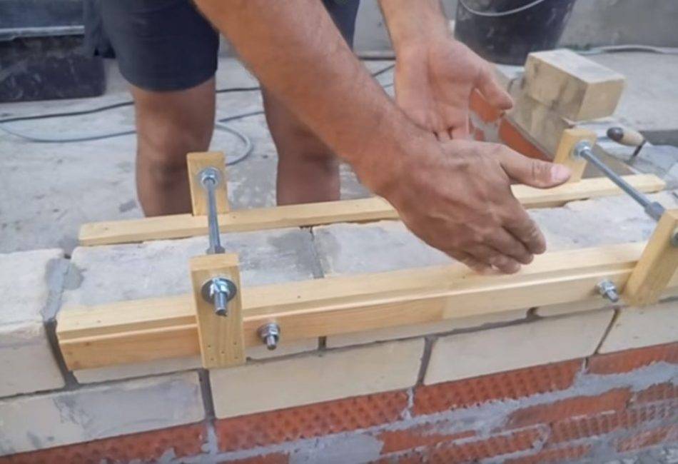 - Рамка с продольно расположенными стенками из дерева. Промежуток между деревянными планками должен соответствовать толщине стены. Так как у этих планок будут присутствовать выдающиеся вперед нижние детали, с их помощью будет удобно выравнивать кирпичи во время укладки.