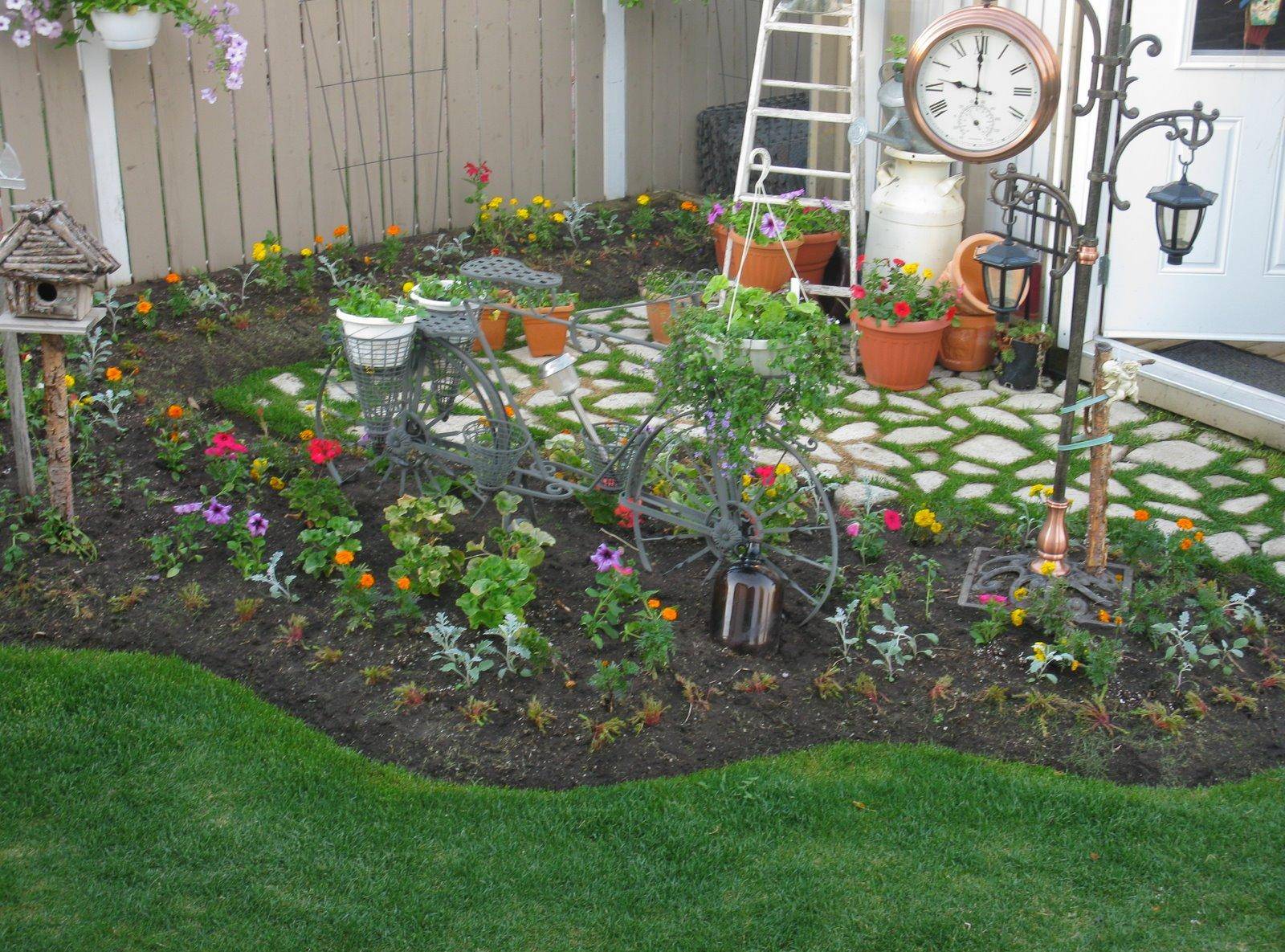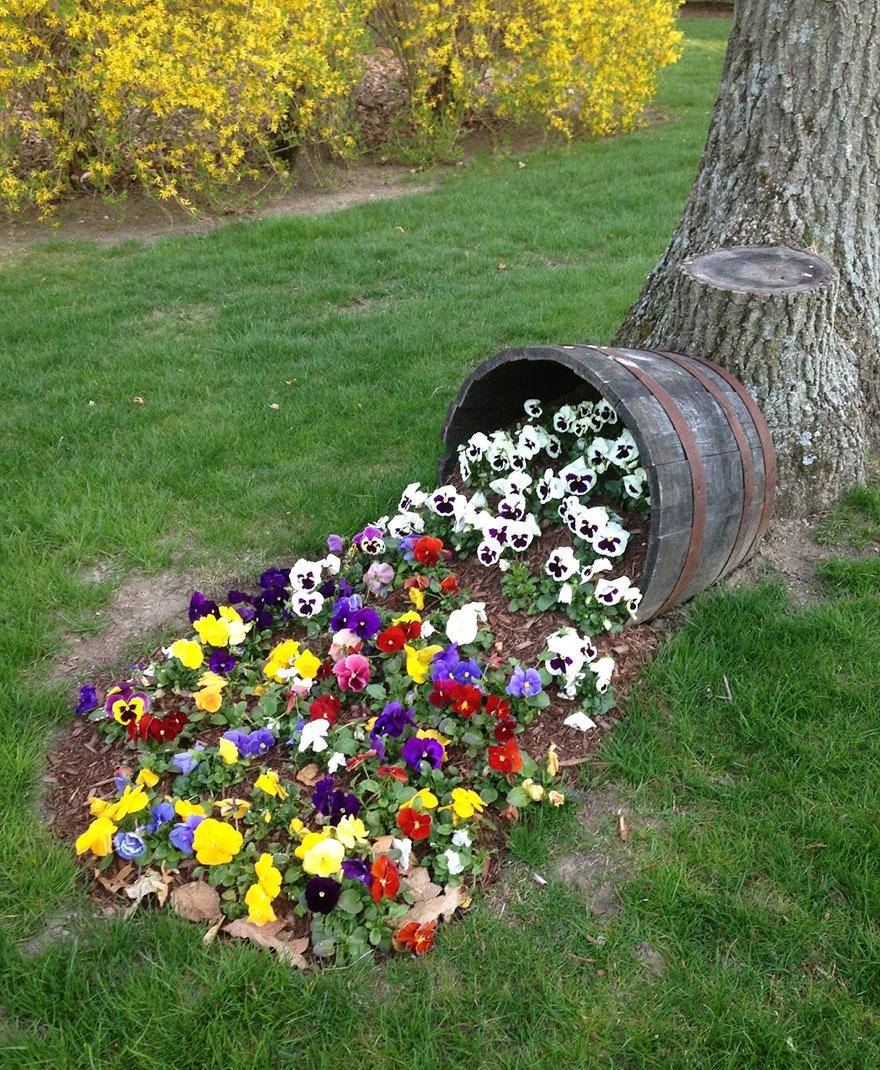 В отличии от идеи для клумб из подручных материалов, в данном случае необходимо придумать оригинальную композицию и оформить ее с помощью цветов.