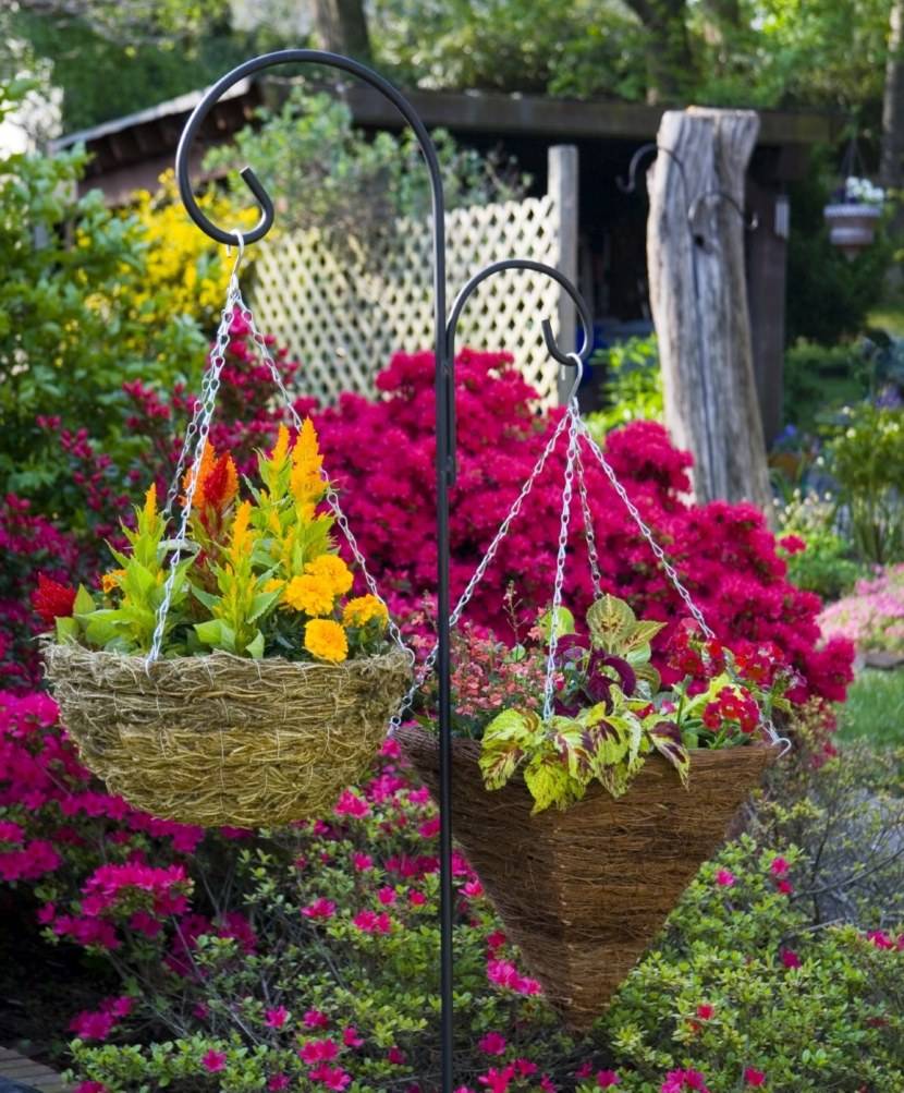 Необычный цветочный столб создают из сетки-рабицы. Ее сворачивают в форме цилиндра, застилают по краям агроволокном, а полученную полость наполняют землей. По периметру трубы делают отверстия, в которые высаживаются растения ампельных сортов.