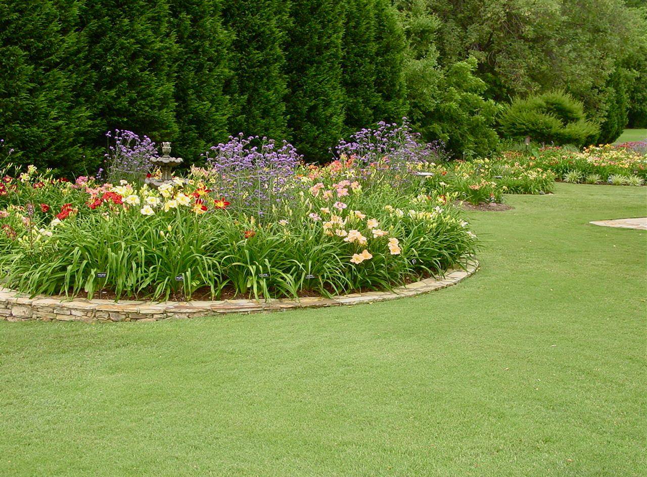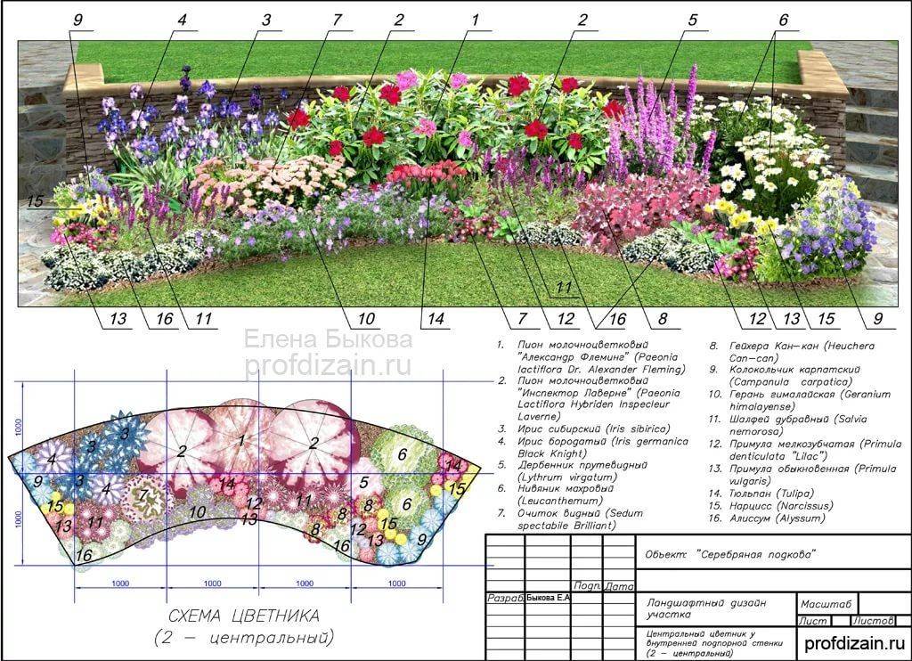 подбору растений по высоте. В центре всегда размещаются самые высокие цветы. Также здесь можно разместить скульптурное украшение. От центра к краям высаживаются более низкие растения. А окантовка цветника делается из почвопокровных цветов;