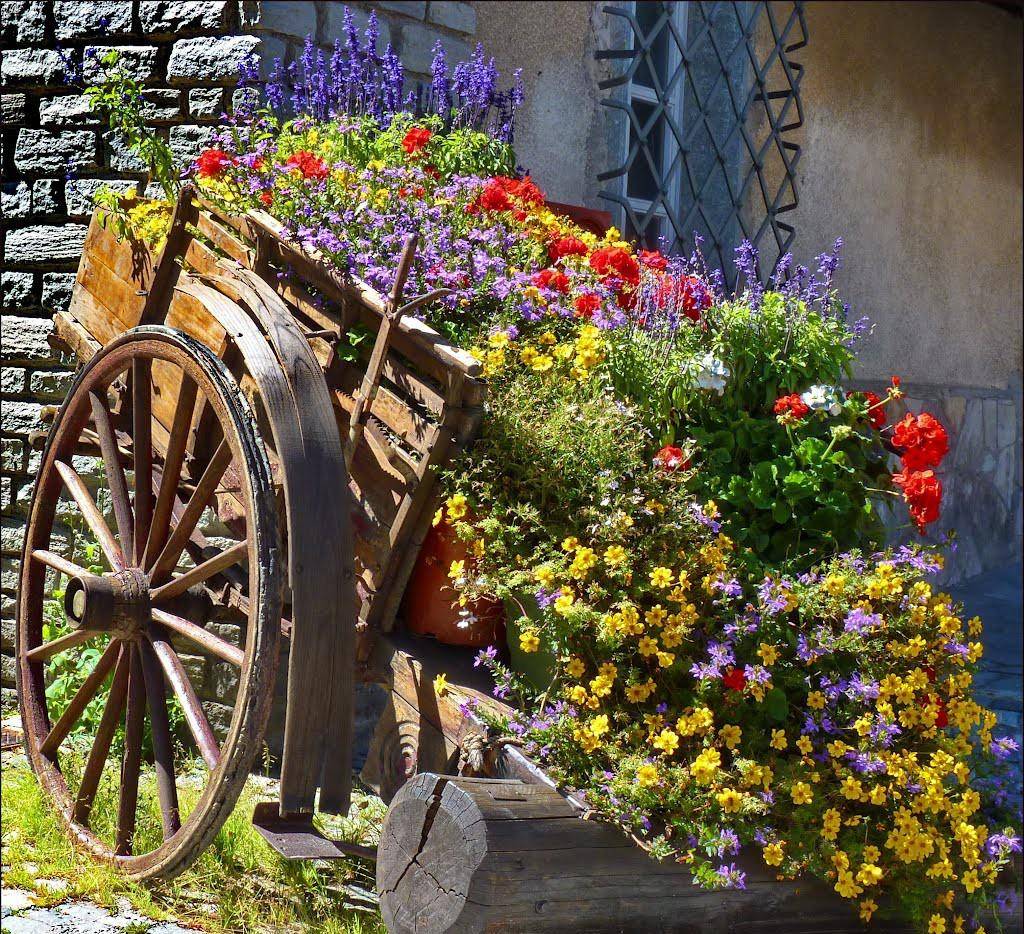 Модный тренд последних лет – оформление клумбы на даче с использованием различных объектов. Тут есть где разгуляться фантазии! Смотрим, что у нас пылится или не используется по назначению и придумываем собственную композицию. В качестве основы для такой оригинальной клумбы подойдет все, что угодно: старые кровати, зонты, стулья. Последний тренд – колеса от телег.