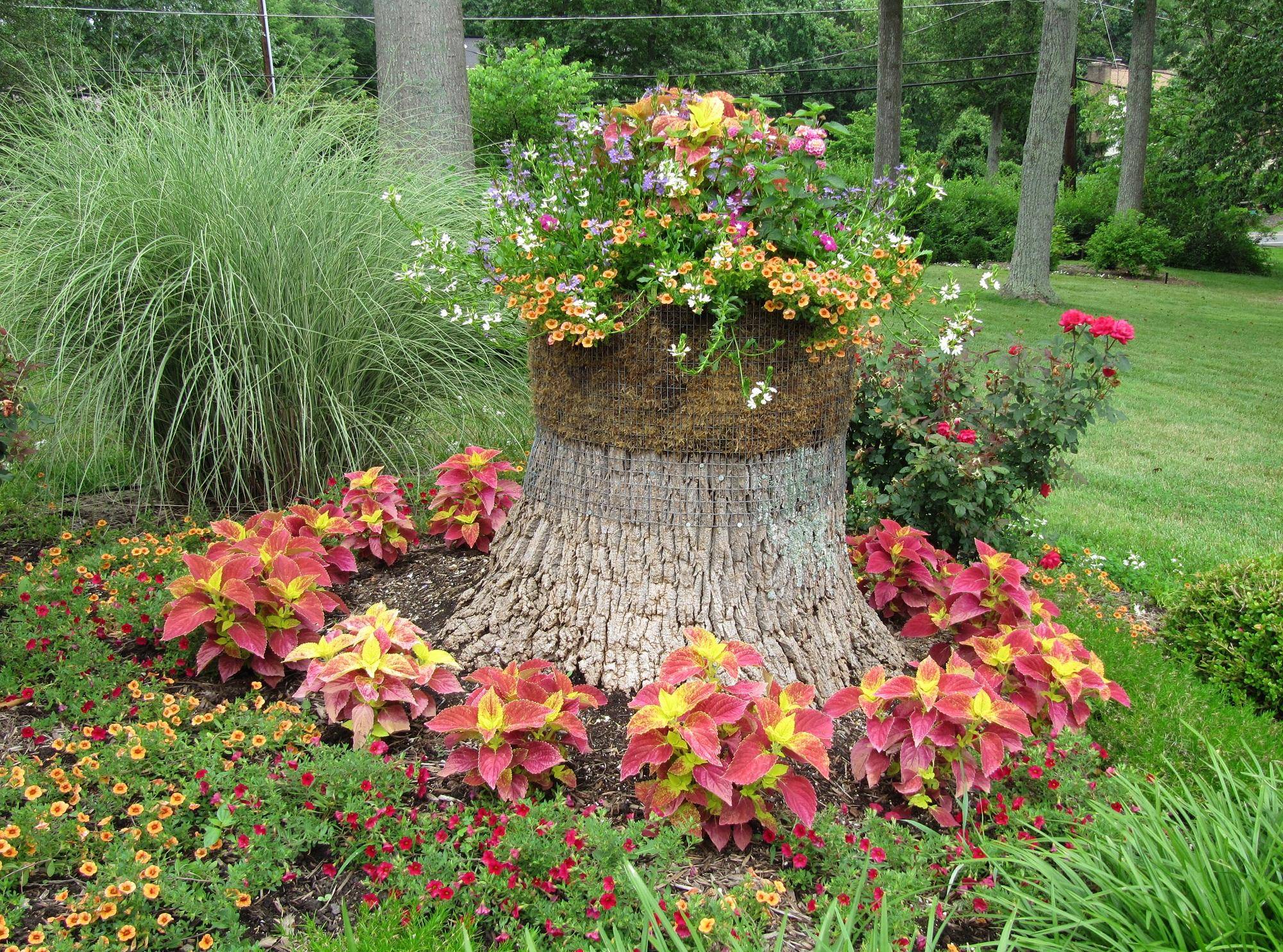Когда дерево высыхает, после его спиливания остается пень, который можно оформить под элегантную и необычную цветущую клумбу. Для этого в центральной части делают углубление, в которое устанавливают сосуд с землей. В него высаживают выбранные растения. Не менее красивая композиция получается, если вдавить под землю боковую часть бревна.