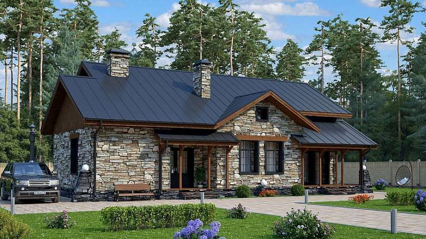 Проекты одноэтажных домов в таком стиле выполняются с невысокими крышами, незаметно выступающими за пределы основного корпуса постройки. Таким образом, образуются мансардные пространства и веранды. Для канадской технологии характерно наличие лоджий и балконов, а отделочные работы можно не выполнять. Если специально состарить цоколь, то можно создать своеобразный живописный дизайн.