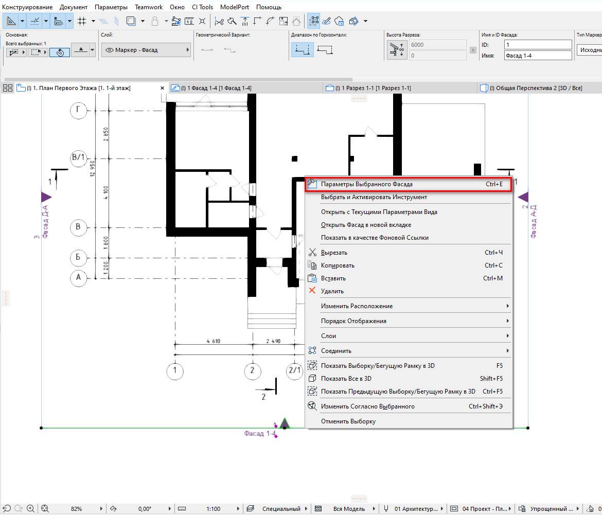 Для того чтобы перейти к настройкам с плана, выберите маркер и кликните по нему правой кнопкой мыши. В появившемся меню выберите первый пункт «Параметры Выбранного Фасада».