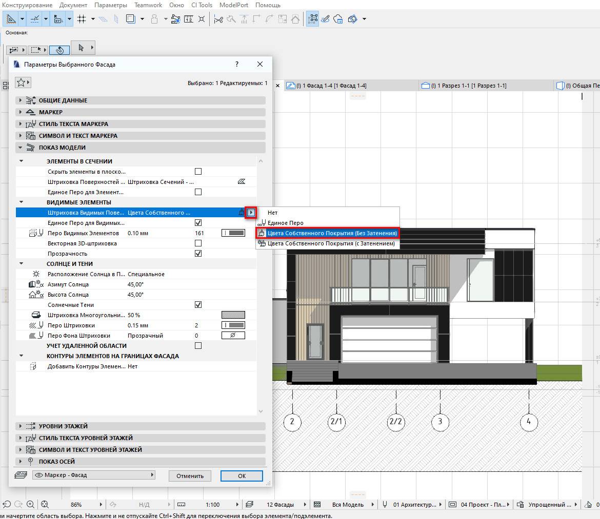 Чтобы элементы на фасаде стали цветными в пункте «Штриховка Видимых Поверхностей» выбираем значение «Цвета Собственного Покрытия».