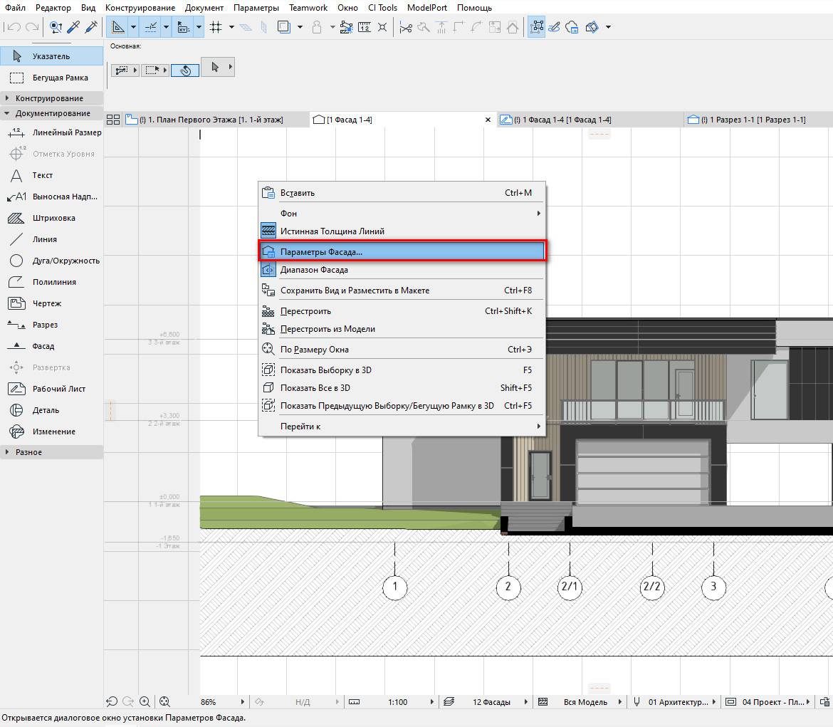 Чтобы перейти в параметры фасада кликните правой кнопкой мыши в любом свободном месте, из меню выберите «Параметры Фасада…».