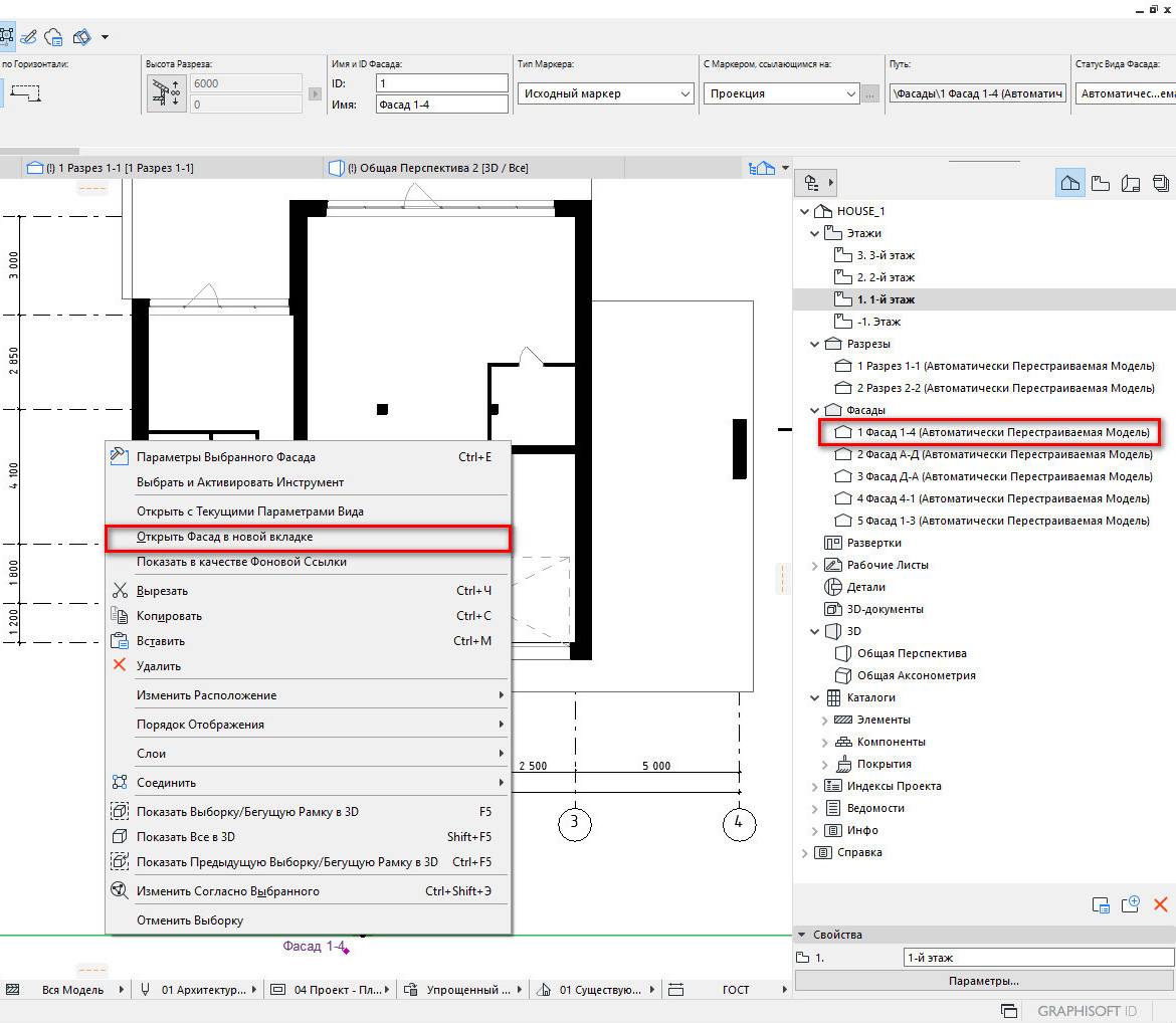 Давайте откроем фасад. Это тоже можно сделать несколькими способами. Из меню, нажав правой кнопкой мыши на фасад, выбрать пункт «Открыть Фасад в новой вкладке». Или через панель навигатора.