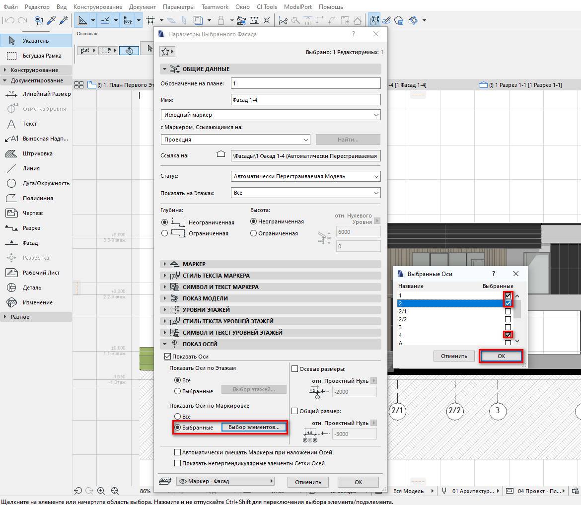 Настройки показа осей находятся на вкладке «ПОКАЗ ОСЕЙ». Выбираем значение «Выбранные» в пункте «Показать Оси по Маркировке». Затем кликаем на кнопку «Выбор элементов…». В открывшемся окне отмечаем оси, которые должны остаться на фасаде. Жмем «ОК».