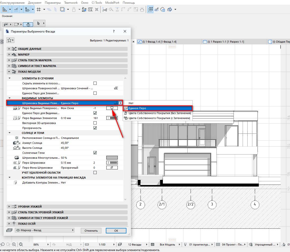 Чтобы сделать заливку всех элементов на фасаде белыми в пункте «Штриховка Видимых Поверхностей» выбираем значение «Единое Перо». Затем выбираем цвет пера в пункте «Перо Видимых Поверхностей».