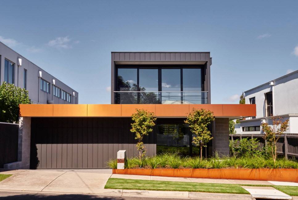 Хай-тек дом с небольшим ухоженным газоном прекрасно смотрится
