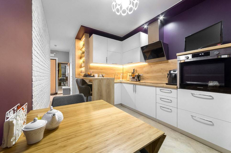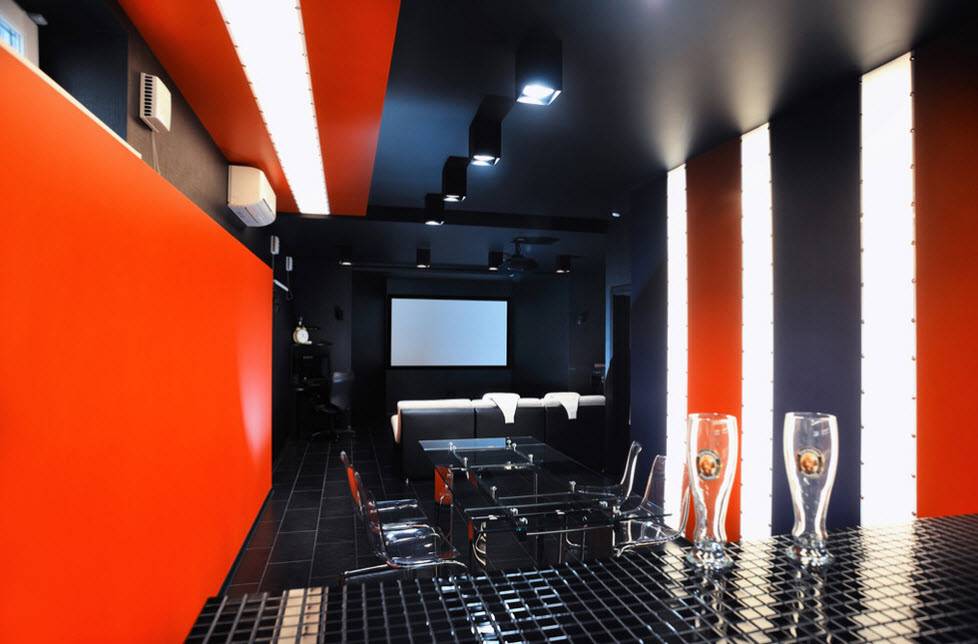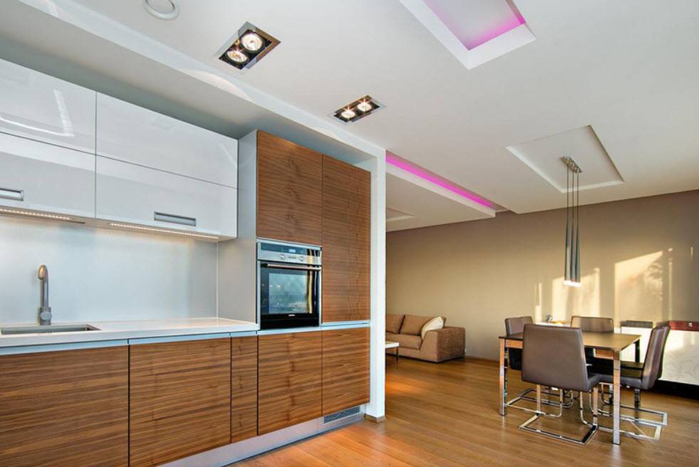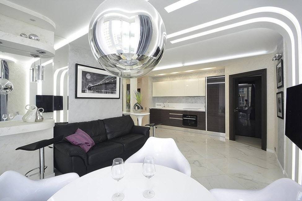- Освещение должно соответствовать стилю, поэтому нужно купить современные лампы и светильники оригинального дизайна с белым или теплым освещением.