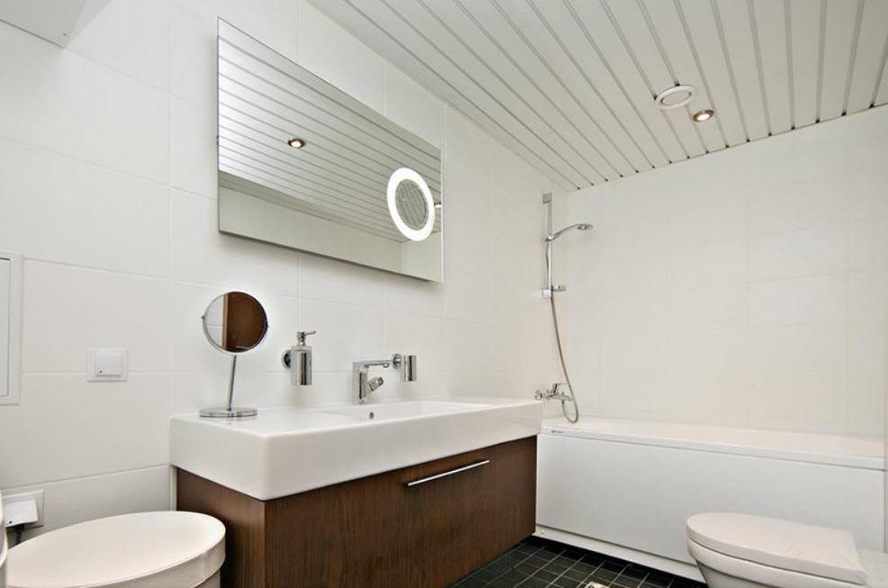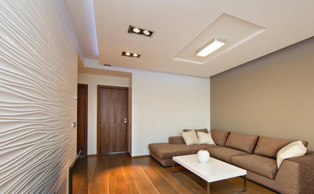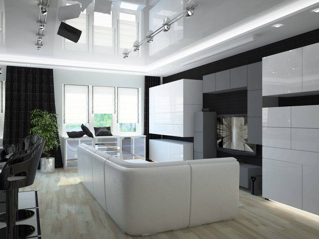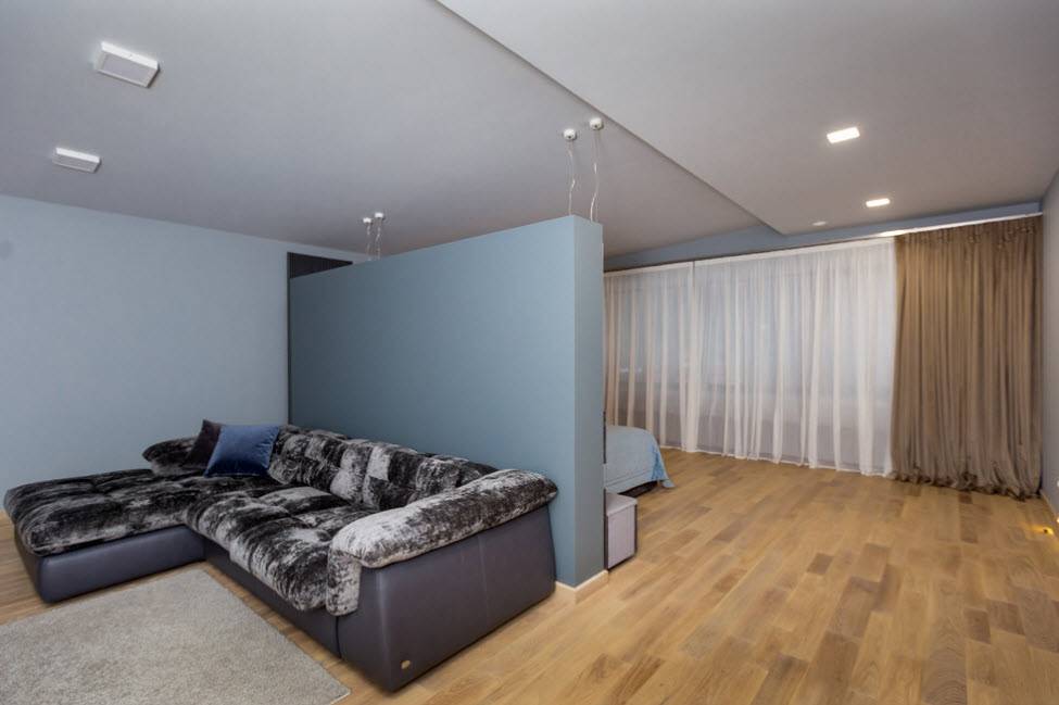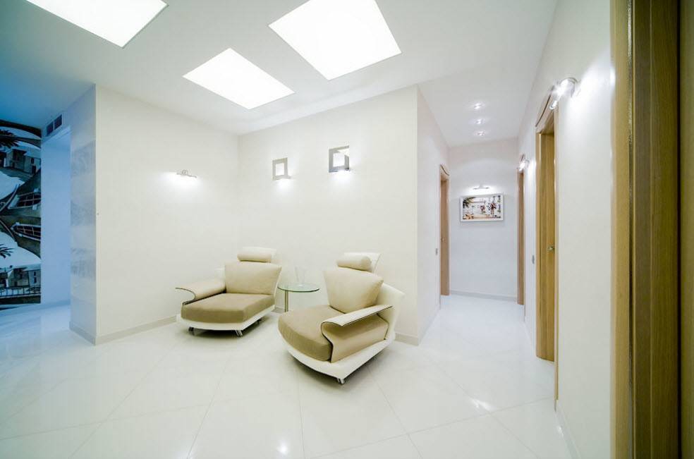 Напольное покрытие – ламинат или паркет, в ванной комнате – наливной пол с подогревом. Потолки – подвесные или натяжные со сложной системой светодиодной подсветки. Отделка стен – покраска, штукатурка или покрытие ламинатом, цветовая гамма – светлая. В ванной можно использовать плитку, при условии, что на ней нет рисунков и узоров.