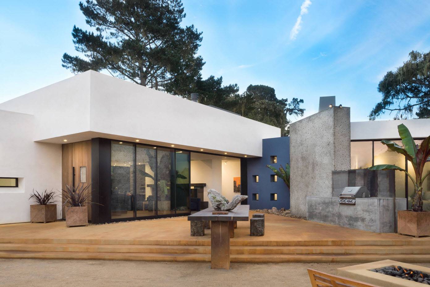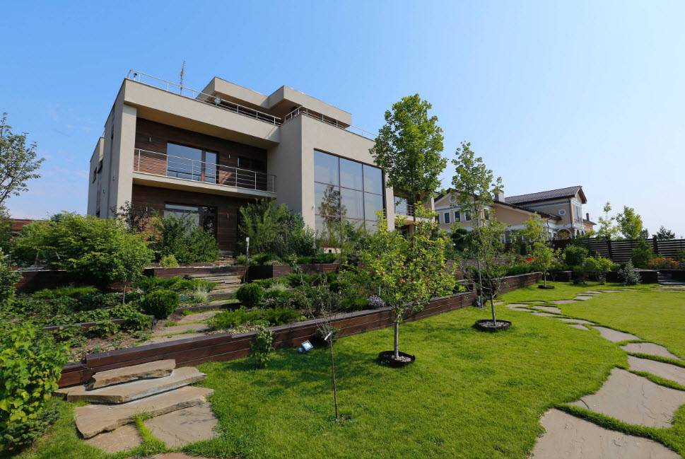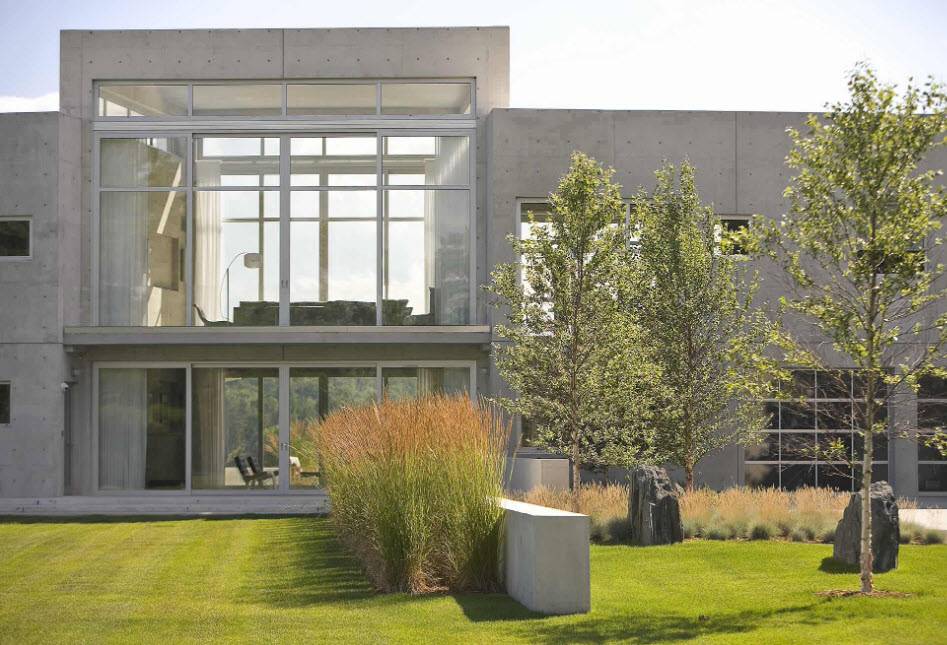 Что касается цвета, то идеальный вариант – это сочетание черного, белого, серого или мраморного оттенков. Яркие детали и рисунки здесь будут неуместными, так как характерны для других стилей. Несмотря на такую категоричность, вокруг дома приветствуются газоны. Но все же они должны меть геометрическую форму. Зачастую на территории не делают ландшафтный дизайн и не высаживают цветы.