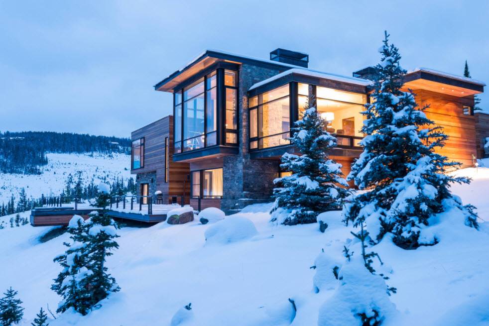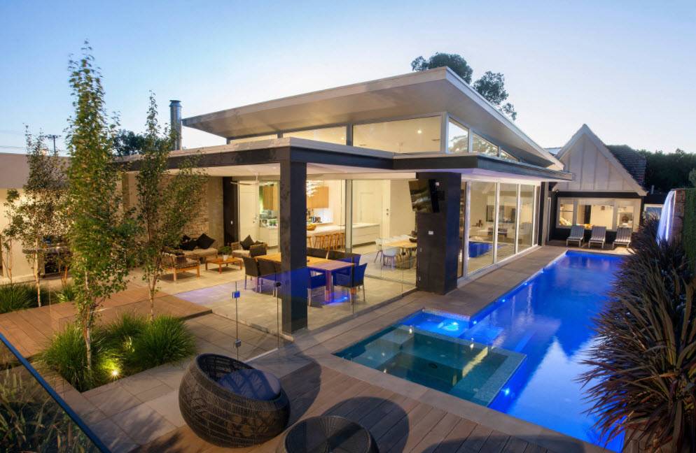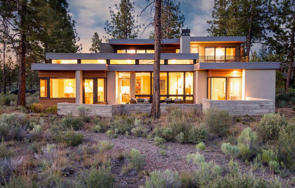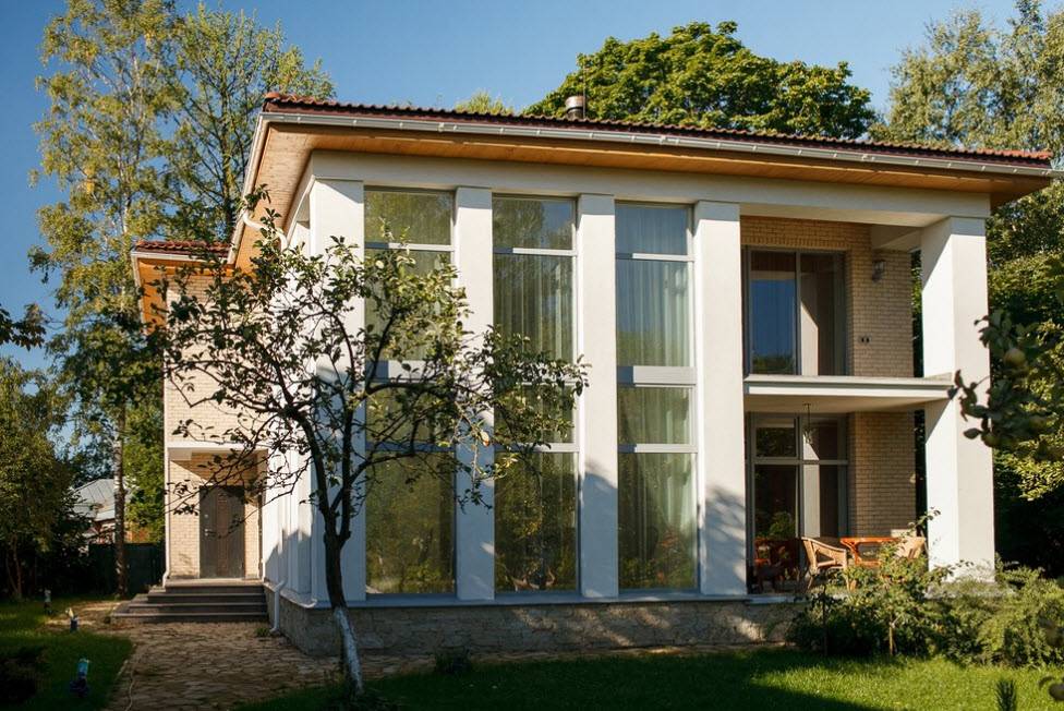 Что касается экстерьера, то дома в данном стиле всегда очень большие. За счет этого обеспечивается внутренний простор с минимальным количеством перегородок и стен. Это же касается и окон, которые должны быть большого размера. Довольно часто такие дома имеют застекленный фасад, что выглядит потрясающе красиво.