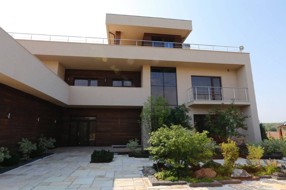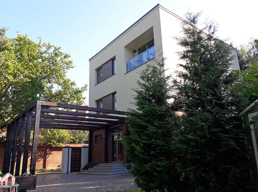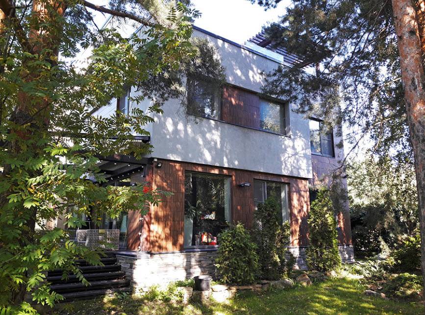 Впрочем, в последнее время, в отделке фасадов начинают присутствовать деревянные элементы, особенно эффектно смотрится комбинированный вариант оштукатуренного фасада и деревянной облицовки. Отделка деревом (это может быть блок-хаус, вагонка или сайдинг под дерево), с одной стороны, позволяет немного смягчить бескомпромиссность и некоторую отстраненность и холодность экстерьера, с другой – позволяет гармонично вписать хай-тек дом в окружающий естественный (особенно лесной) пейзаж.
