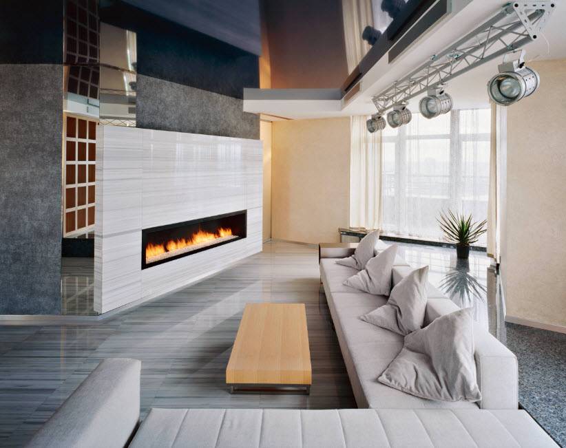 Одной из важнейших составляющих стиля служит освещение, которого должно быть много. В оптимальном случае используются сложные и комбинированные системы освещения со светильниками нескольких типов. На окнах вместо штор используют жалюзи, основная цветовая палитра – нейтральные тона (белый, серый и черный). Все поверхности должны быть гладкими, блестящими или хромированными, что позволяет визуально увеличить пространство.