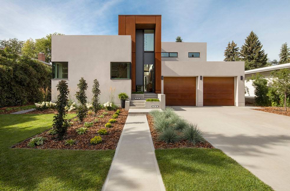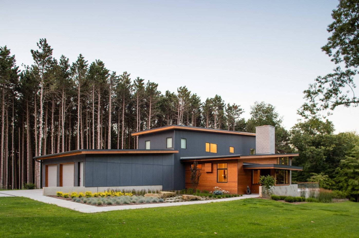 В свою очередь, дерево практически не используется, за исключением редких случаев. К примеру, отделка деревом позволяет смягчить строгость линий фасада. А также помогает дому органично выглядеть на фоне природы.