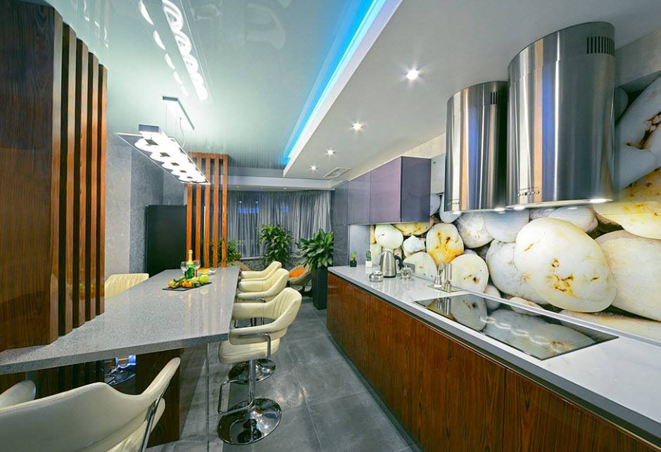 Очень популярные металлические поверхности, глянцевое свечение пластика, игра с фактурами «под серебро». Часто в экстерьере и интерьере современных апартаментов просматриваются акценты на природные расцветки. Это может быть лаконичные древесные узоры, мраморные «трещины», имитация иных природных материалов.