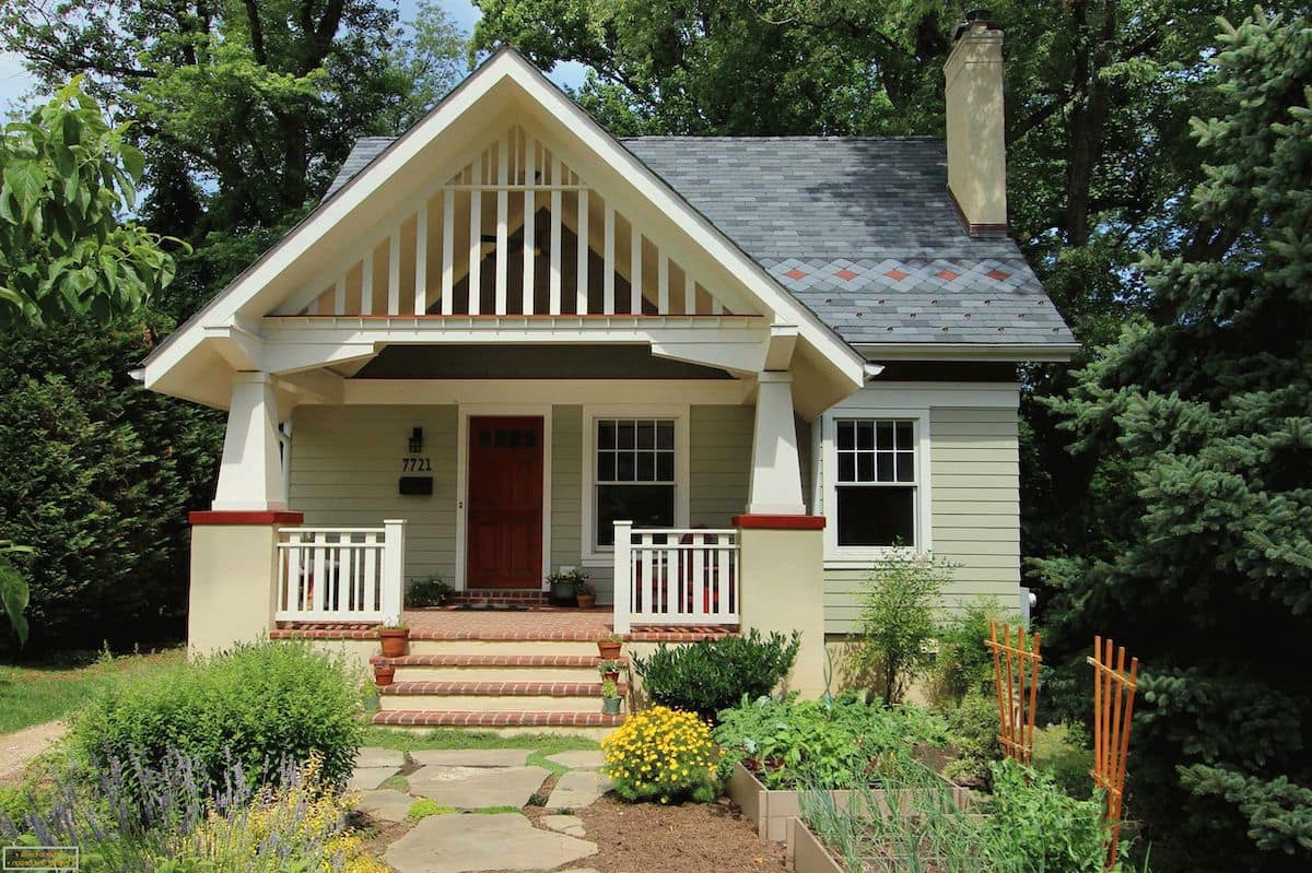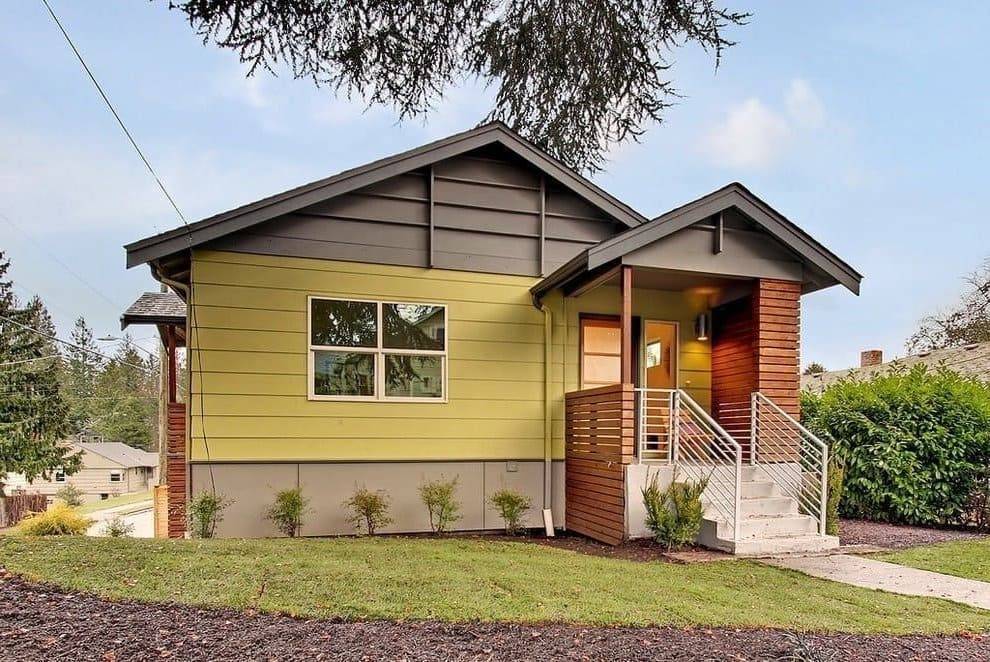 Этот домик, за исключением крыльца и навеса для автомобиля, имеет площадь 37,6 кв.м. Несмотря на небольшие размеры, у него две спальни — одна внизу, другая в мансарде.