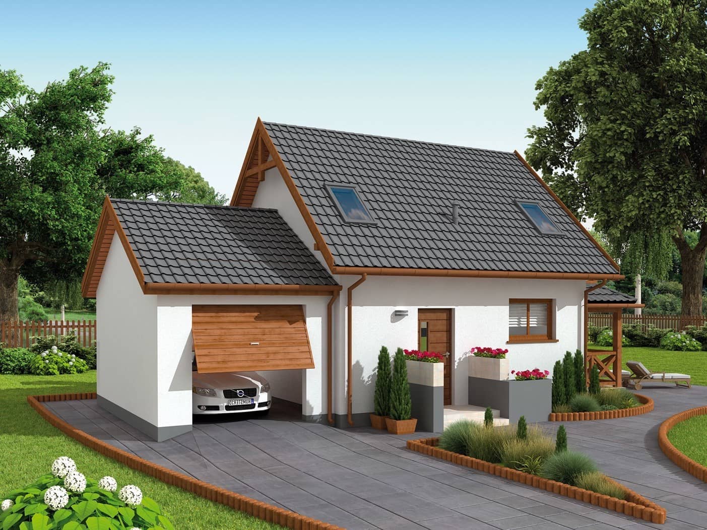 Проект небольшого двухэтажного дома для дачи с пристроенным гаражом: жилая площадь 100 кв. м, общая 127 кв. м, гараж на одну машину