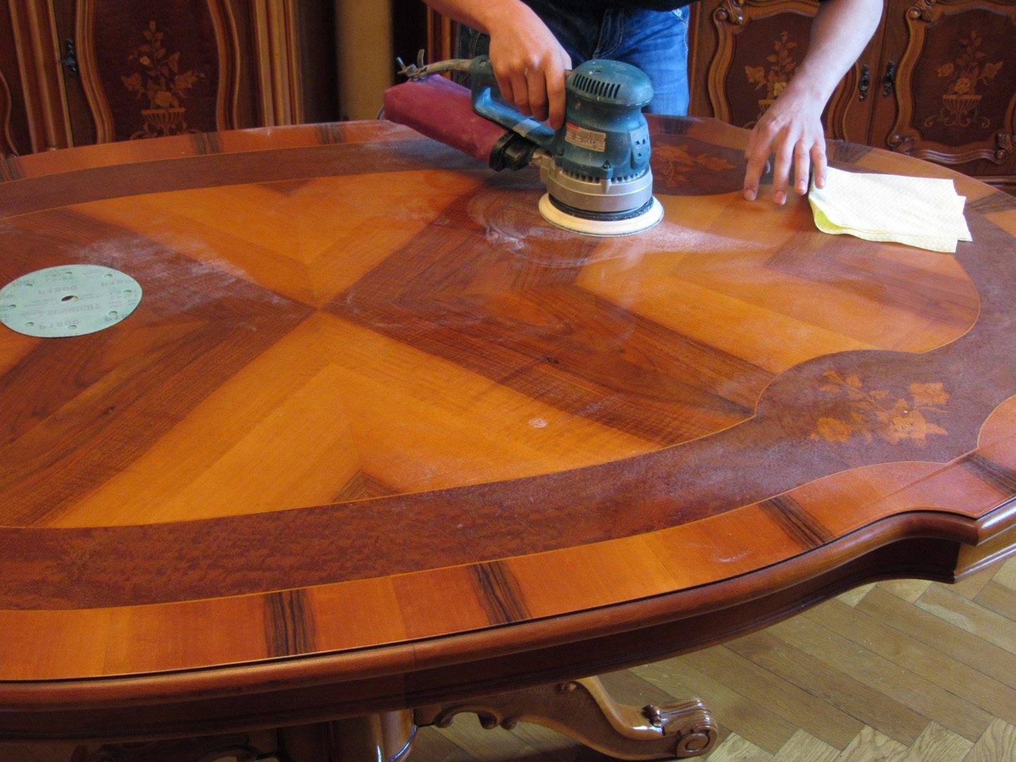 Чтобы масло хорошо легло и впиталось, древесину шлифуют, начиная с более грубых абразивов, постепенно переходя к более тонким. Так же после каждого абразива покрытие очищается. Возможно, понадобится его подшпаклевать, устраняя более глубокие царапины. Оптимально подойдет специальный реставрационный набор, основанный на воске.
