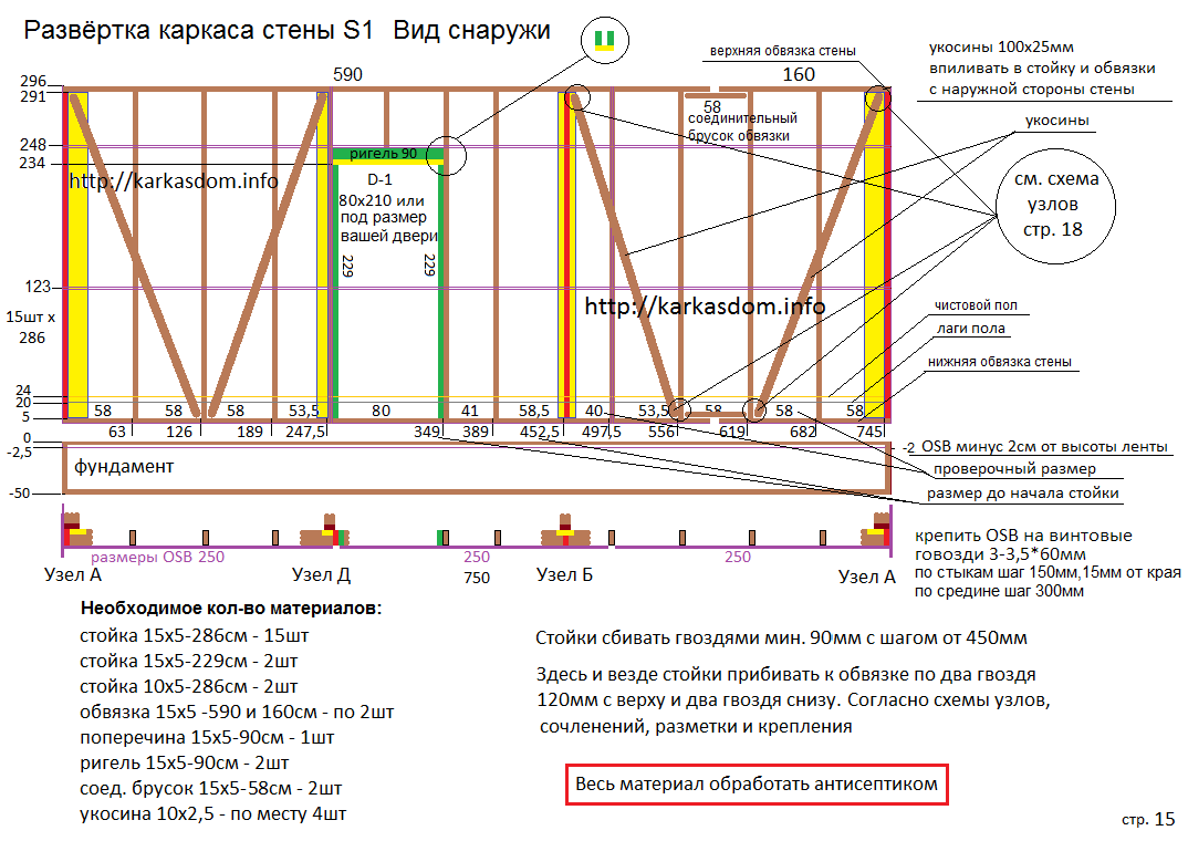Комплект рабочих схем и узлов к проекту, включает: размеры до начала стоек с двух сторон в см., включая проверочные размеры между стойками, места установки укосин, размеры проёма окна/двери и его усиления, планы последовательности и места установки листов OSB (ОСП) снаружи, также все планы, где необходимо, содержат комплектовочную ведомость, комментарии и технологию соединения стоек в углах, по технологии тёплый угол, и схему примыкания внутренних стен