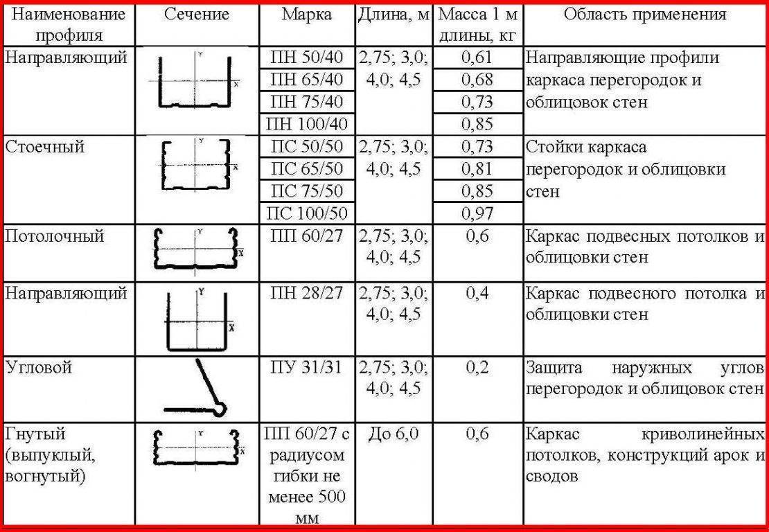Для сборки одноуровневой или многоуровневой конструкции понадобятся две разновидности оцинкованных профилей, выполняющих определенные функции и имеющих свое назначение: