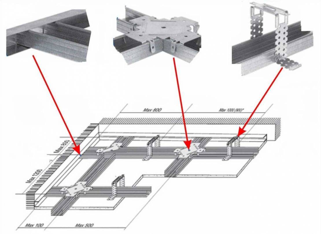 При сборке металлического каркаса на потолке используются различные приспособления, комплектующие и вспомогательные детали: