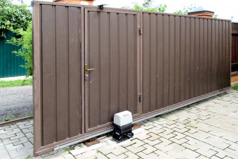 - калитка не должна помешать свободному перемещению створки, поэтому лучше сделать так, чтобы она располагалась с противоположной стороны. Достойным решением станут ворота, калитка которых встроена в общую конструкцию. У такого варианта есть высокий порог, который является ее основным недостатком. Он усложняет проход пожилым людям и детям;