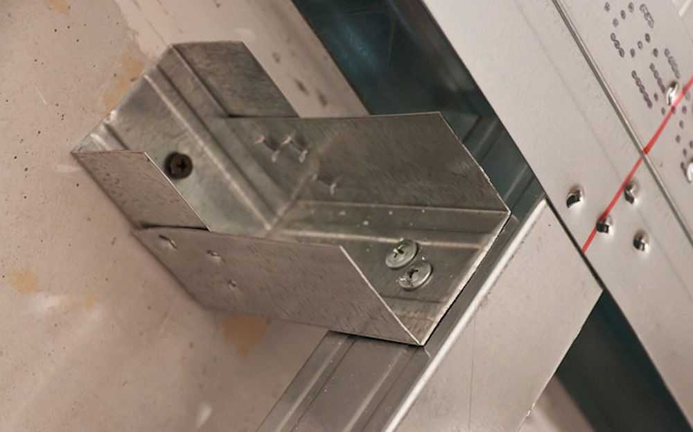 - В месте соединения профилей нет выступа. При монтаже на заклепки или саморезы, головка выступает над поверхностью профиля. У самореза больше, у заклепок меньше. Это мешает листу гипсокартона ложиться ровно, без загибов. При использовании просекателя, загибы остаются с «изнаночной» стороны профиля. Лицевая получается без выступов. Лист ложится ровно, что уменьшает время на шпаклевку и ее расход.