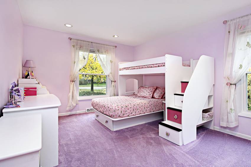 Угловое расположение кроватей. Когда спальные мета находятся не одно над другим, а у двух прилегающих стен. Тогда внизу тоже есть возможность организовать рабочее место или игровое пространство (игровой домик).