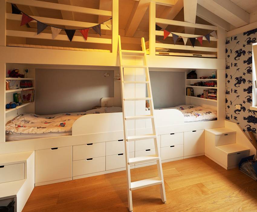 Лестницы из перекладин или ступеней могут располагаться впереди — по длинной стороне кроватей. При этом их иногда делают по центру, иногда — справа или слева. Еще вариант — лестницы с торца. Еще их делают вертикальными, и тогда они места почти не занимают, а иногда — под углом. Взбираться на такие проще, но не всегда их можно поставить: площадь не позволяет, да и за торчащие ножки легко зацепиться.